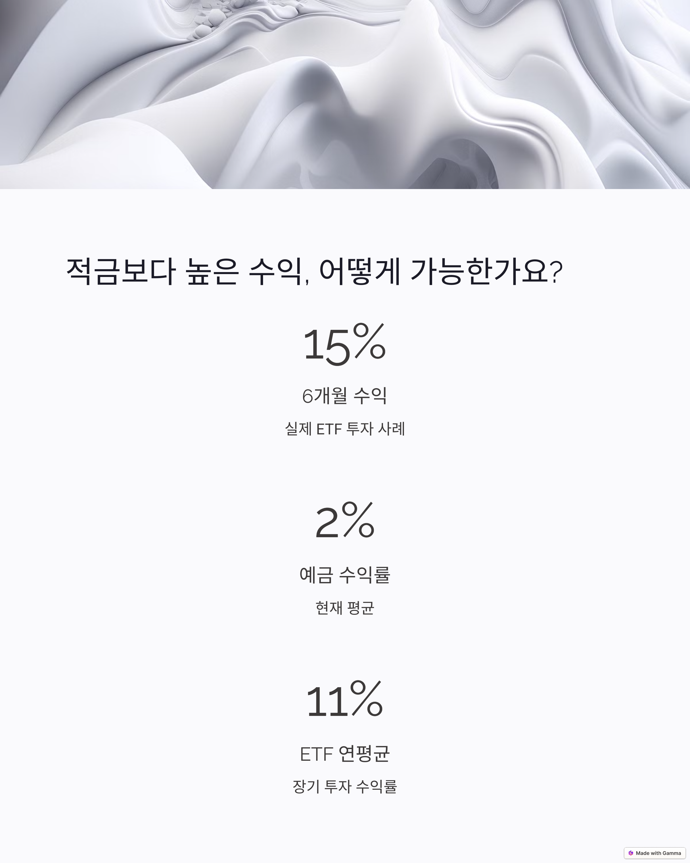 적금은 안정적인 금융 상품으로 많은 사람들이 선택하지만, 실질 수익률은 매우 낮은 편입니다. 월 10만 원씩 3년간 적금을 들 경우 세후 이자는 약 13만 원 정도로 제한적입니다. 반면, ETF는 분산 투자 방식으로 구성되어 보수적인 연 6% 수익률만 가정하더라도 같은 기간 약 60만 원 이상의 차이를 만들어낼 수 있습니다. 물론 ETF는 원금 보장이 되지 않지만 장기적인 시각과 꾸준한 적립식 투자를 적용하면 리스크를 낮추면서 수익률은 높일 수 있는 현실적인 대안이 됩니다.