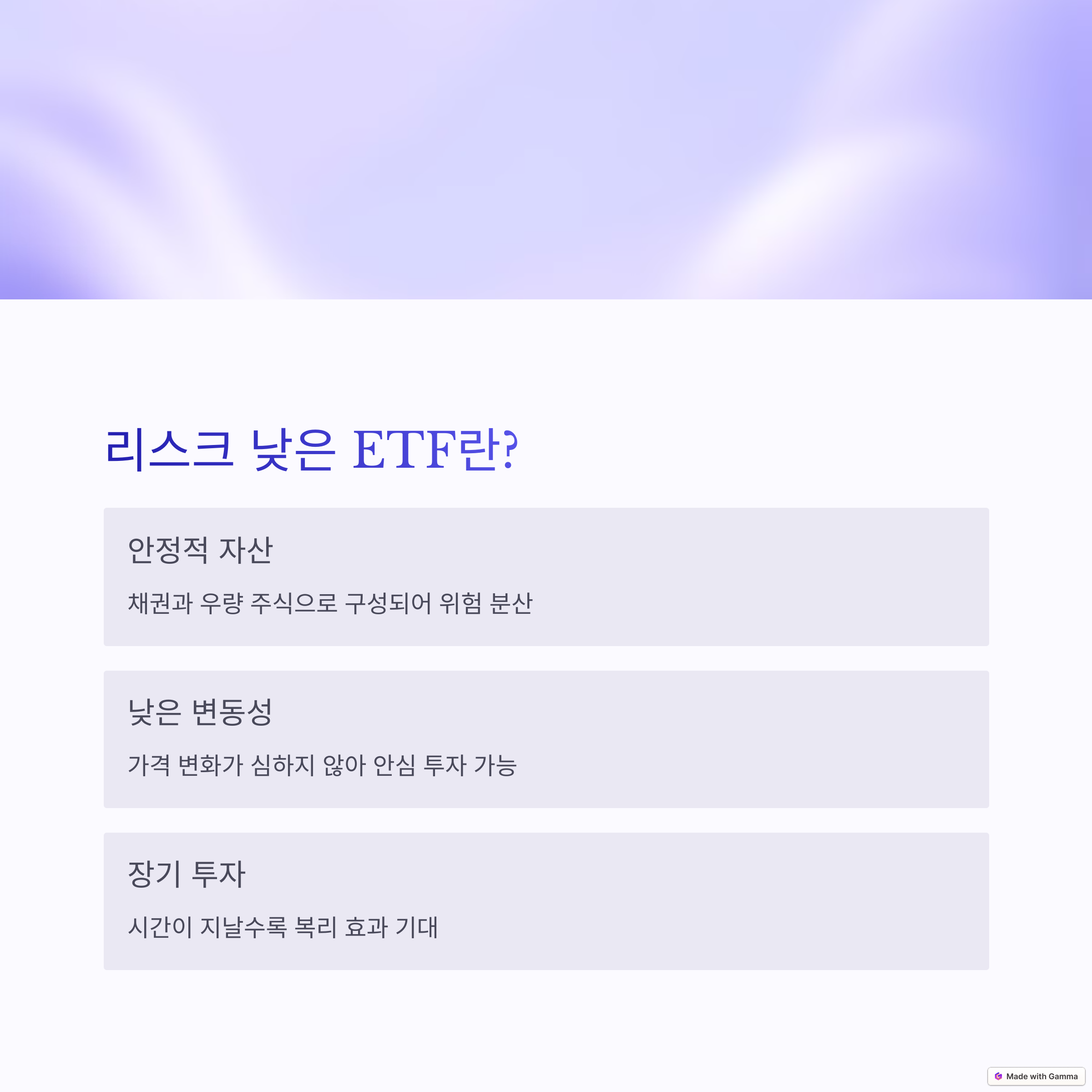 | 저위험 ETF | 초보자 투자 | 안정적 수익 |