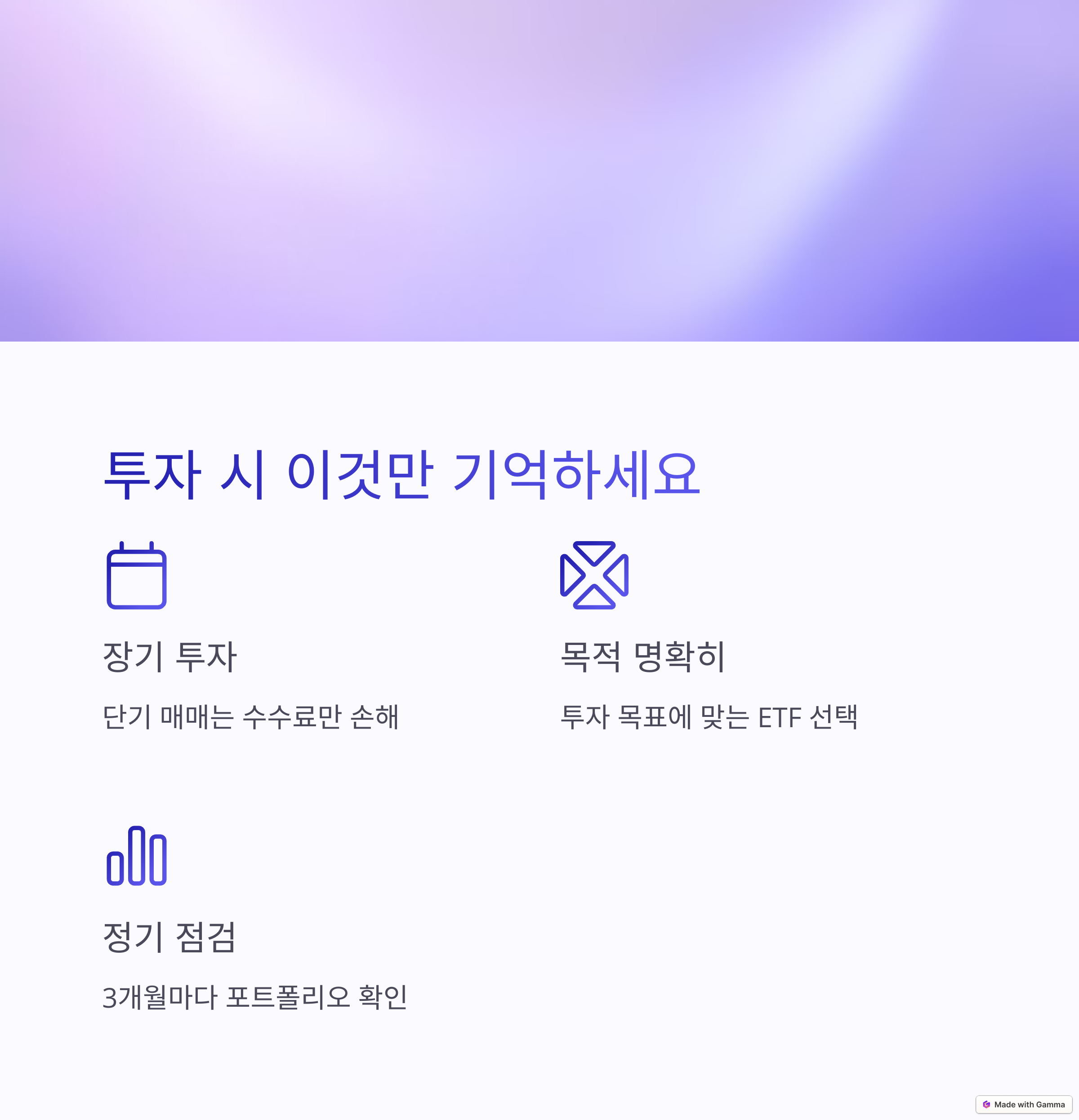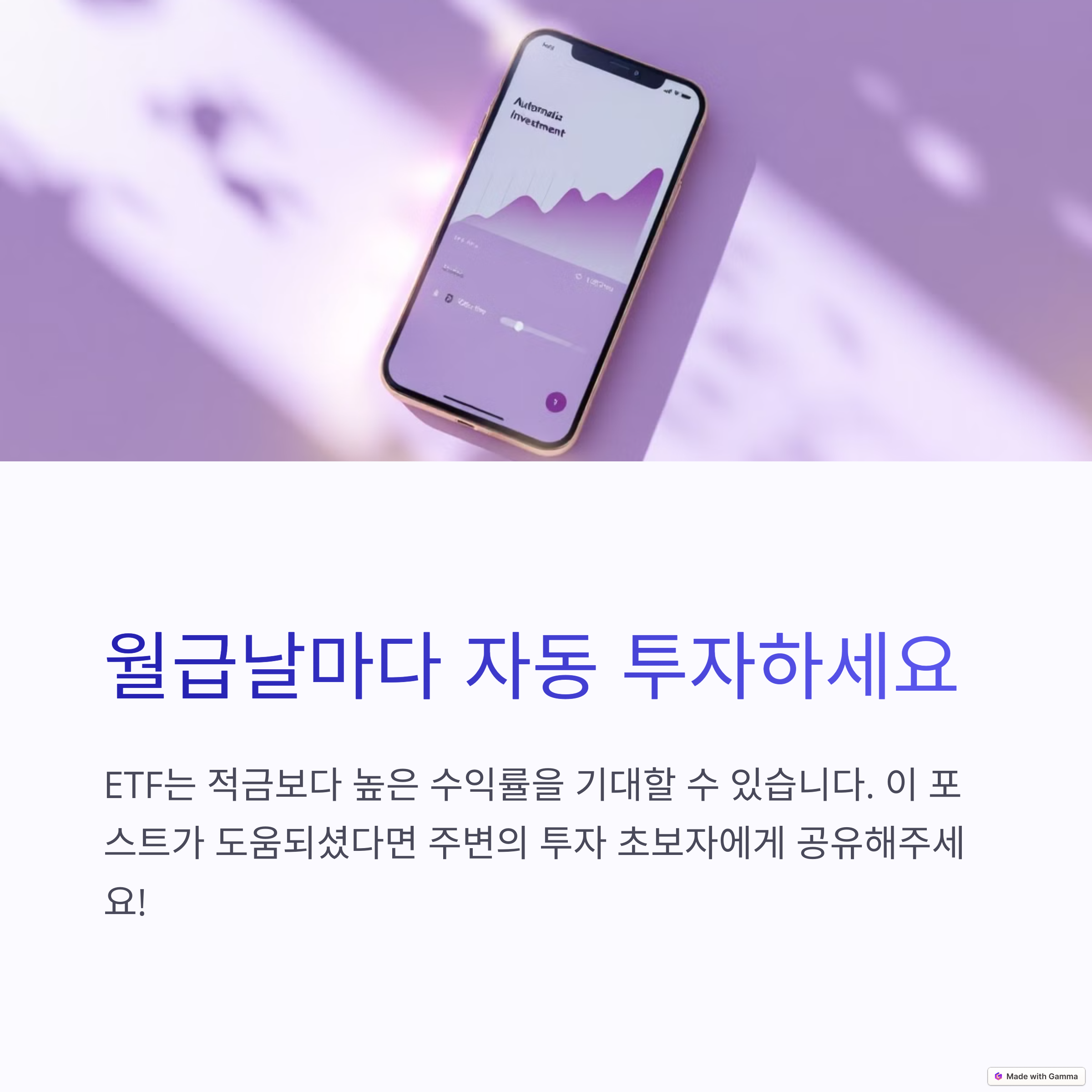 ETF 투자는 월급 일부를 자동이체해 정기 매수하는 루틴을 만들면, 적금처럼 편하게 지속할 수 있습니다. 수익률은 단기간에 눈에 띄지 않을 수 있지만, 복리의 힘은 시간을 만나면 생각보다 훨씬 큰 차이를 만들어냅니다. 중요한 건, 지금 당장 작은 금액으로 시작하는 것입니다.