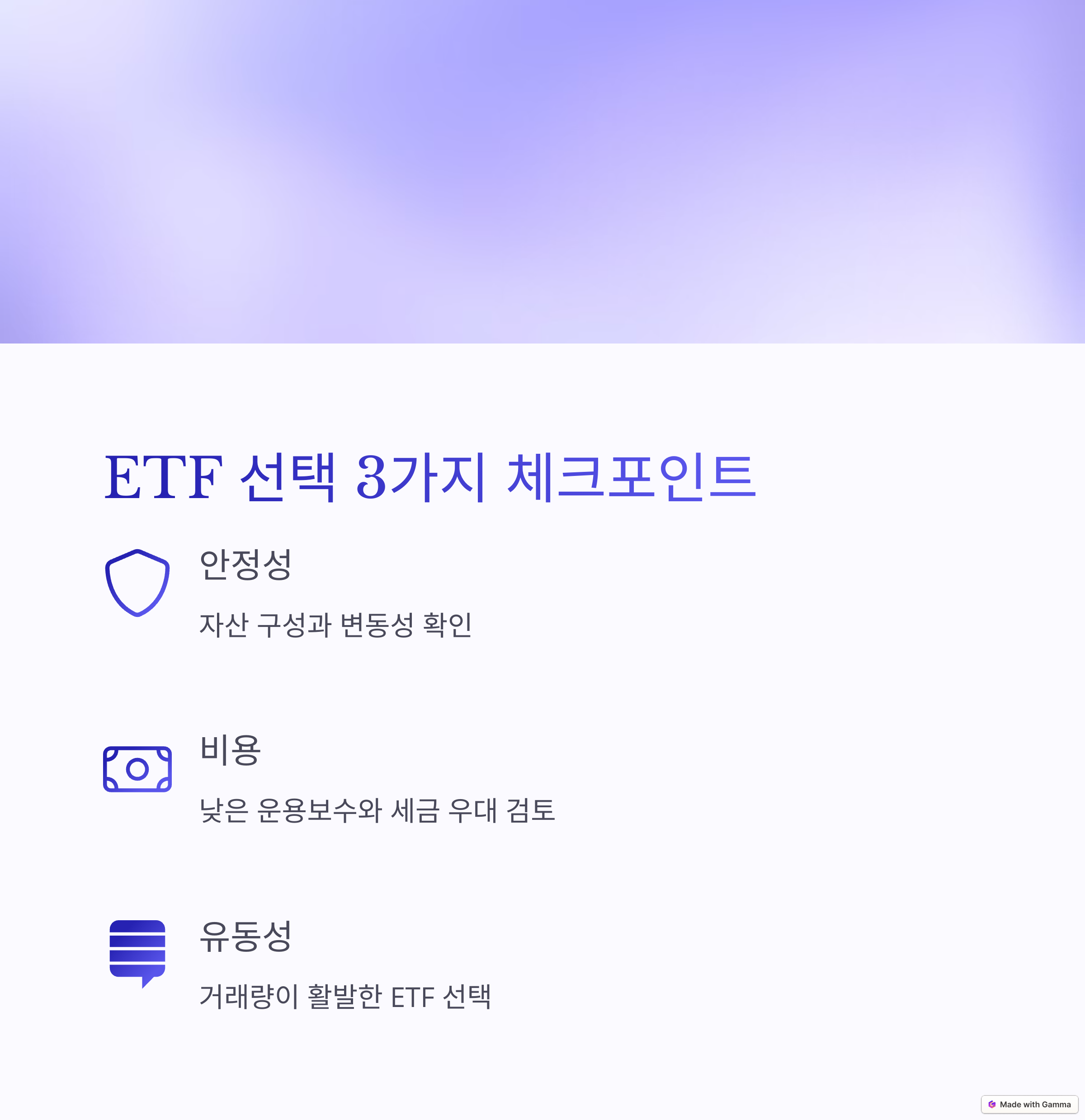 ETF는 다양한 종목에 분산 투자할 수 있는 구조로 개별 주식보다 위험이 낮고, 초보자에게 특히 적합한 투자 방식입니다. 특히 시장 대표 지수를 추종하는 ETF나 채권 기반 상품, 배당 중심 ETF는 안정성과 예측 가능성이 높아 꾸준한 수익을 원하는 투자자에게 좋습니다. 투자 초기에 흔히 겪는 감정적 불안정성을 줄여주고 장기적으로 좋은 투자 습관을 만드는 데도 매우 효과적입니다.